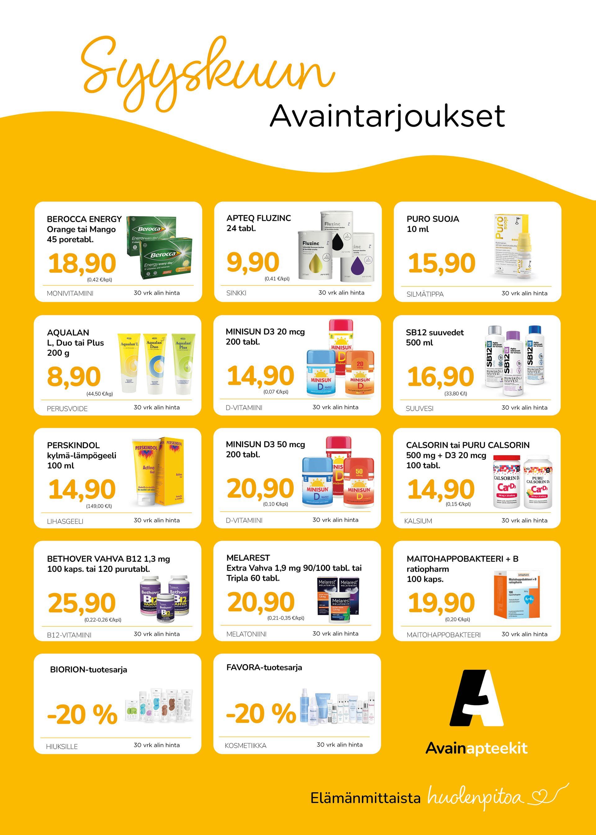 Apteekissamme ovat voimassa Avainapteekkien yhteiset kuukausitarjoukset, joiden lisäksi tarjoamme monia vaihtuvia etuja asiakkaillemme. Tutustu viimeisimpiin tarjouksiimme, tule ostoksille tai kysy lisää!